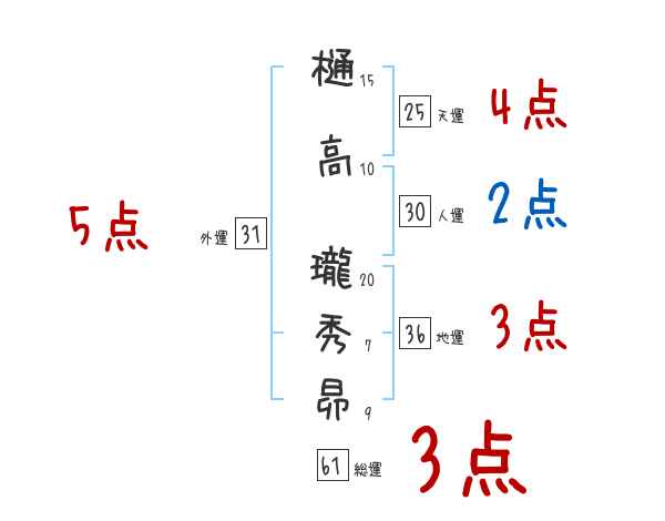 外運![]() | 樋高瓏秀昴さんの外運は31画の5つ星!社交性があり判断力に優れる。順風満帆な人生で円満な生活。 生活面を象徴する運勢です。外部から受ける影響力を表し、結婚運、家庭運や職場、環境への順応性を表します。 |