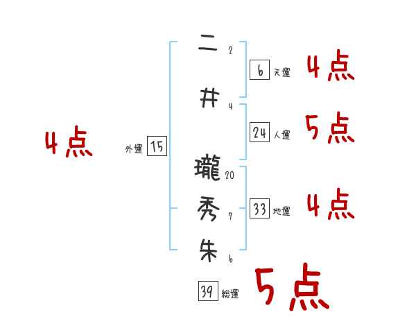 天運![]() | 二井瓏秀朱さんの天運は6画の4つ星!慎重な努力家で信頼を得る。誠実な精神で向上心に優れる。 家系が持つ宿命的な運勢を表します。祖先から受け継いだ苗字ですので自分の力が及びません。家柄を象徴します。 |