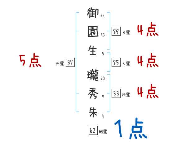外運![]() | 御園生瓏秀朱さんの外運は37画の5つ星!努力家で順応性に優れる。現実的な考え方ができ忠実に物事をこなす。 生活面を象徴する運勢です。外部から受ける影響力を表し、結婚運、家庭運や職場、環境への順応性を表します。 |