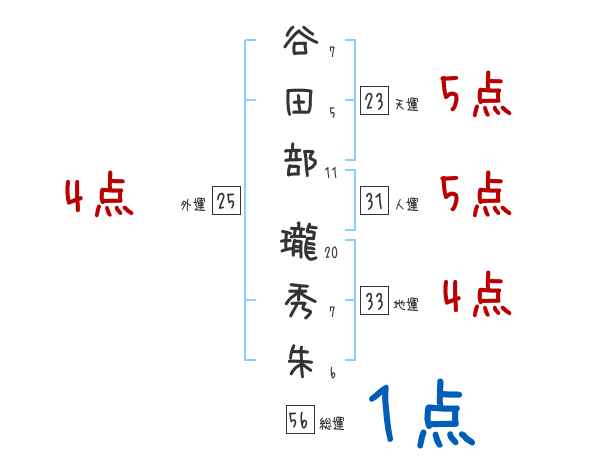 | 天運  | 谷田部瓏秀朱さんの天運は23画の5つ星!想像力に優れ活力がある。一代で成功し名誉を手に入れる。家系が持つ宿命的な運勢を表します。祖先から受け継いだ苗字ですので自分の力が及びません。家柄を象徴します。 |