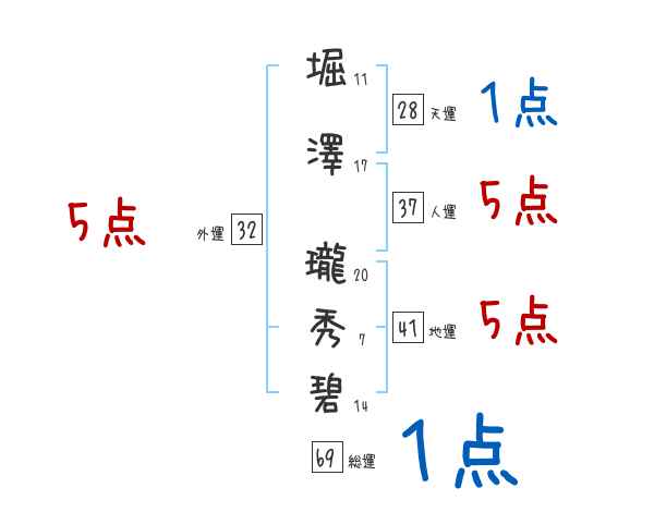 外運![]() | 堀澤瓏秀碧さんの外運は32画の5つ星!柔軟性があり成功する。チャンスが多く金運が良い。 生活面を象徴する運勢です。外部から受ける影響力を表し、結婚運、家庭運や職場、環境への順応性を表します。 |