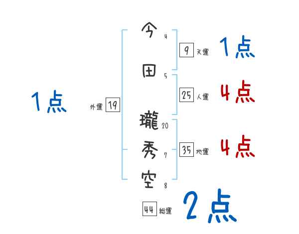 天運![]() | 今田瓏秀空さんの天運は9画の1つ星!消極的で才能を発揮することが苦手なことも。周りの意見に耳を傾けましょう。 家系が持つ宿命的な運勢を表します。祖先から受け継いだ苗字ですので自分の力が及びません。家柄を象徴します。 |