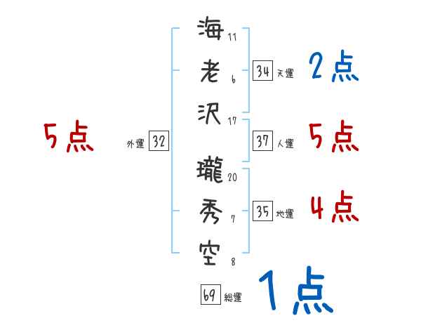 外運![]() | 海老沢瓏秀空さんの外運は32画の5つ星!柔軟性があり成功する。チャンスが多く金運が良い。 生活面を象徴する運勢です。外部から受ける影響力を表し、結婚運、家庭運や職場、環境への順応性を表します。 |