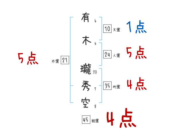 天運![]() | 有木瓏秀空さんの天運は10画の1つ星!不安を感じやすい傾向。ストレスを抱えないように注意しましょう。 家系が持つ宿命的な運勢を表します。祖先から受け継いだ苗字ですので自分の力が及びません。家柄を象徴します。 |