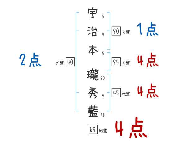 総運![]() | 宇治本瓏秀藍さんの総運は65画の4つ星!幸運に恵まれ繁栄する。包容力がある。 あなたの人生を表す1番重要な運勢です。生涯を通じて影響する総合運となり、主に50歳以降の晩年期に影響を及ぼします。 |