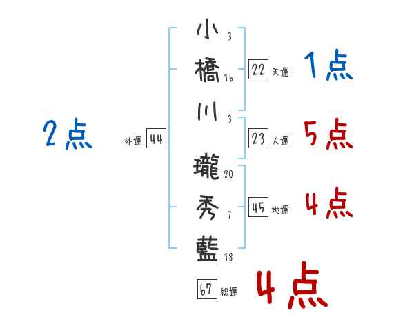 人運![]() | 小橋川瓏秀藍さんの人運は23画の5つ星!想像力に優れ活力がある。一代で成功し名誉を手に入れる。 性格や才能などを表す2番目に重要な運勢です。人間関係や協調性、社会的な成功に影響します。主に20歳から50歳ぐらいまでの中年期の運勢を表します。 |