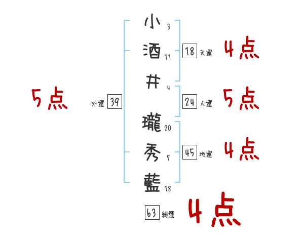 外運![]() | 小酒井瓏秀藍さんの外運は39画の5つ星!社交性に優れ人望が厚い。人の上に立ち成功する。 生活面を象徴する運勢です。外部から受ける影響力を表し、結婚運、家庭運や職場、環境への順応性を表します。 |