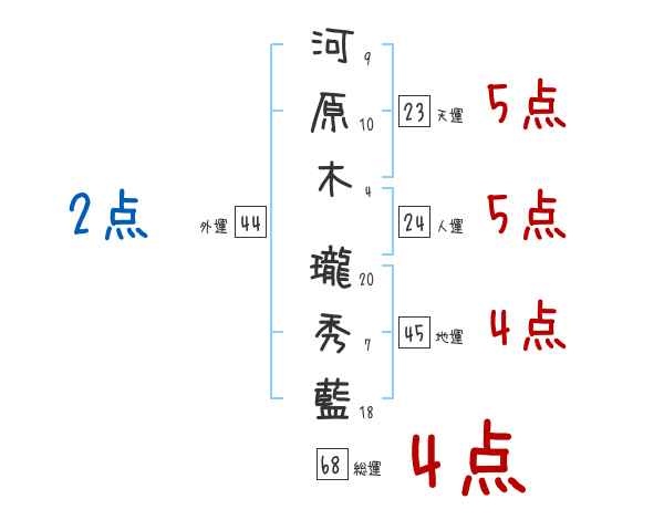 天運![]() | 河原木瓏秀藍さんの天運は23画の5つ星!想像力に優れ活力がある。一代で成功し名誉を手に入れる。 家系が持つ宿命的な運勢を表します。祖先から受け継いだ苗字ですので自分の力が及びません。家柄を象徴します。 |