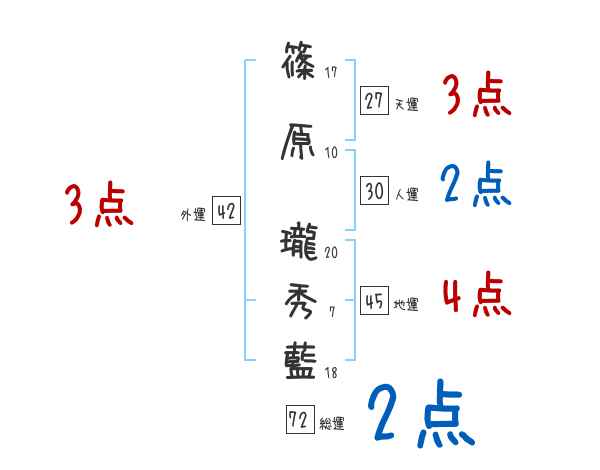 外運![]() | 篠原瓏秀藍さんの外運は42画の3つ星!病気に注意。多芸であるが消極的でおとなしい。 生活面を象徴する運勢です。外部から受ける影響力を表し、結婚運、家庭運や職場、環境への順応性を表します。 |