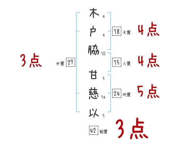 天運![]() | 木戸脇甘慈以さんの天運は18画の4つ星!情熱的で剛気。忍耐力があり信頼される。 家系が持つ宿命的な運勢を表します。祖先から受け継いだ苗字ですので自分の力が及びません。家柄を象徴します。 |