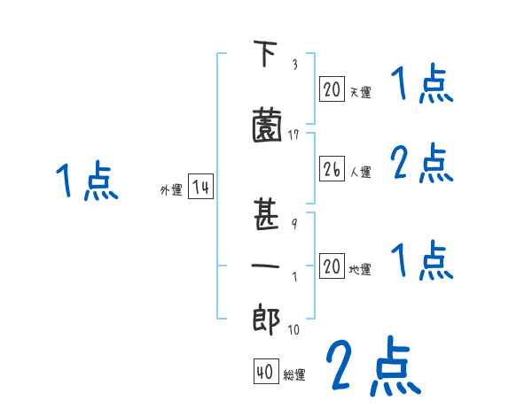 外運![]() | 下薗甚一郎さんの外運は14画の1つ星!人に対して優しいがストレスを溜め込みがち。人間関係のトラブルを避けるよう気をつけましょう。 生活面を象徴する運勢です。外部から受ける影響力を表し、結婚運、家庭運や職場、環境への順応性を表します。 |