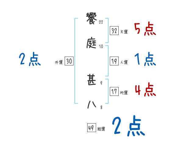 天運![]() | 饗庭甚八さんの天運は32画の5つ星!柔軟性があり成功する。チャンスが多く金運が良い。 家系が持つ宿命的な運勢を表します。祖先から受け継いだ苗字ですので自分の力が及びません。家柄を象徴します。 |