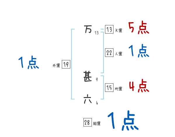 人運![]() | 万甚六さんの人運は22画の1つ星!努力することが苦手ないっぽう手先が器用。芸術性にも優れる。 性格や才能などを表す2番目に重要な運勢です。人間関係や協調性、社会的な成功に影響します。主に20歳から50歳ぐらいまでの中年期の運勢を表します。 |