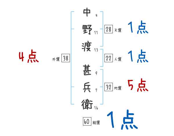 外運![]() | 中野渡甚兵衛さんの外運は38画の4つ星!温厚な性格で技術的な才能を発揮する。職人的な仕事に向いている。 生活面を象徴する運勢です。外部から受ける影響力を表し、結婚運、家庭運や職場、環境への順応性を表します。 |