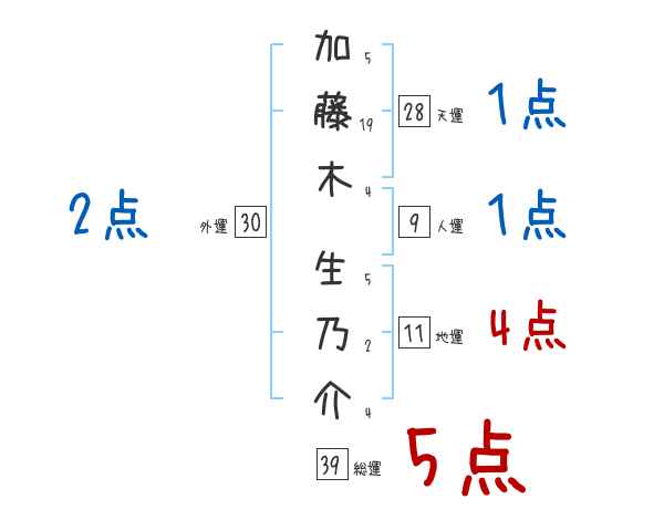 天運![]() | 加藤木生乃介さんの天運は28画の1つ星!家庭環境に注意。スポーツで活躍できる能力があるかも。 家系が持つ宿命的な運勢を表します。祖先から受け継いだ苗字ですので自分の力が及びません。家柄を象徴します。 |