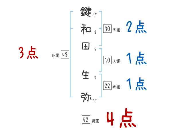 天運![]() | 鍵和田生弥さんの天運は30画の2つ星!浮き沈みの激しさに注意しましょう。 家系が持つ宿命的な運勢を表します。祖先から受け継いだ苗字ですので自分の力が及びません。家柄を象徴します。 |