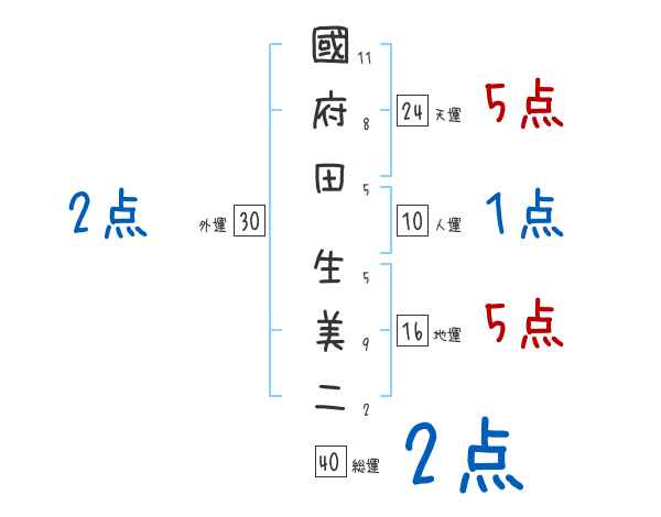人運![]() | 國府田生美二さんの人運は10画の1つ星!不安を感じやすい傾向。ストレスを抱えないように注意しましょう。 性格や才能などを表す2番目に重要な運勢です。人間関係や協調性、社会的な成功に影響します。主に20歳から50歳ぐらいまでの中年期の運勢を表します。 |
