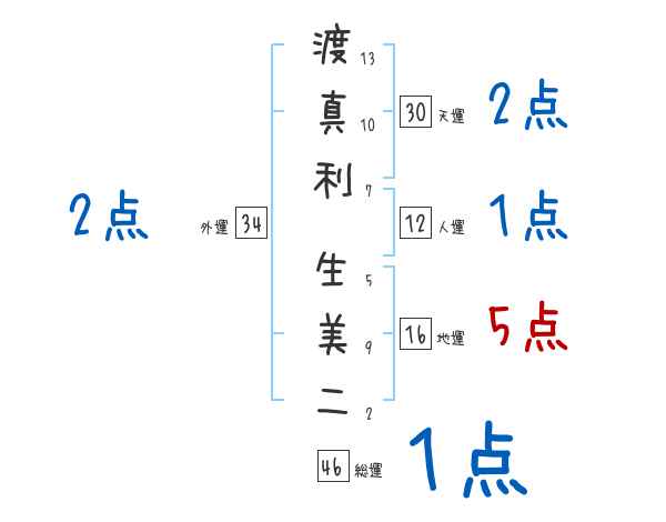 天運![]() | 渡真利生美二さんの天運は30画の2つ星!浮き沈みの激しさに注意しましょう。 家系が持つ宿命的な運勢を表します。祖先から受け継いだ苗字ですので自分の力が及びません。家柄を象徴します。 |