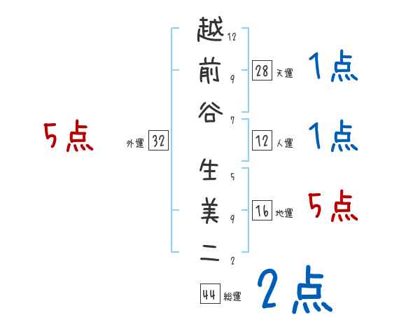 外運![]() | 越前谷生美二さんの外運は32画の5つ星!柔軟性があり成功する。チャンスが多く金運が良い。 生活面を象徴する運勢です。外部から受ける影響力を表し、結婚運、家庭運や職場、環境への順応性を表します。 |
