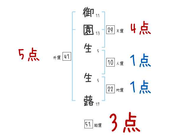 総運![]() | 御園生生蕗さんの総運は51画の3つ星!変化が激しく、危険に注意。堅実な性格。 あなたの人生を表す1番重要な運勢です。生涯を通じて影響する総合運となり、主に50歳以降の晩年期に影響を及ぼします。 |