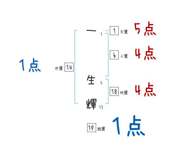 天運![]() | 一生輝さんの天運は1画の5つ星!行動力、指導力があり出世し繁栄する。幸運に恵まれる。 家系が持つ宿命的な運勢を表します。祖先から受け継いだ苗字ですので自分の力が及びません。家柄を象徴します。 |