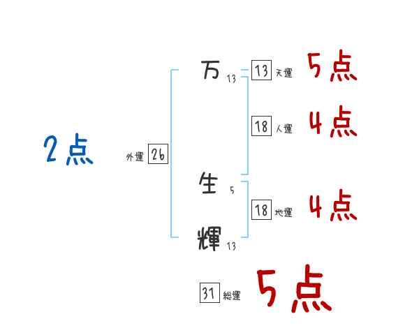 外運![]() | 万生輝さんの外運は26画の2つ星!波瀾万丈かも。信頼できる人を大事にしましょう。 生活面を象徴する運勢です。外部から受ける影響力を表し、結婚運、家庭運や職場、環境への順応性を表します。 |