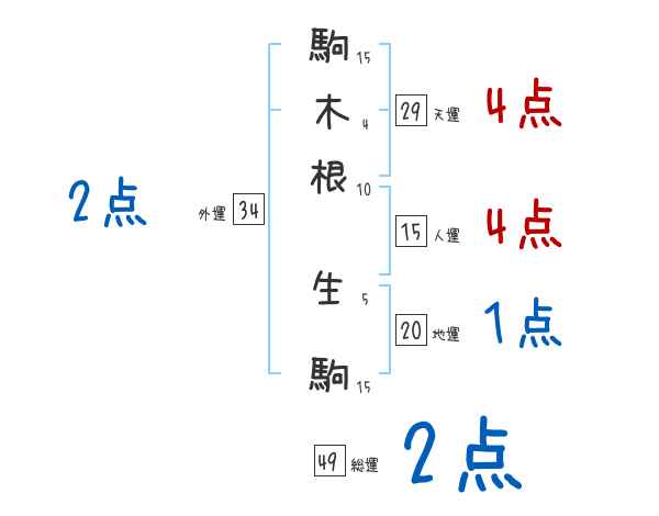 人運![]() | 駒木根生駒さんの人運は15画の4つ星!人徳があり出世する。順調に物事を進め円満な人生。 性格や才能などを表す2番目に重要な運勢です。人間関係や協調性、社会的な成功に影響します。主に20歳から50歳ぐらいまでの中年期の運勢を表します。 |
