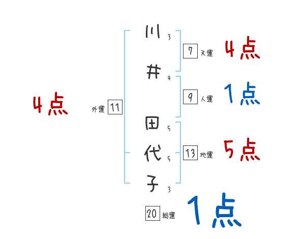 天運![]() | 川井田代子さんの天運は7画の4つ星!強い意志や信念を持ち独立心が強い。自立する。 家系が持つ宿命的な運勢を表します。祖先から受け継いだ苗字ですので自分の力が及びません。家柄を象徴します。 |