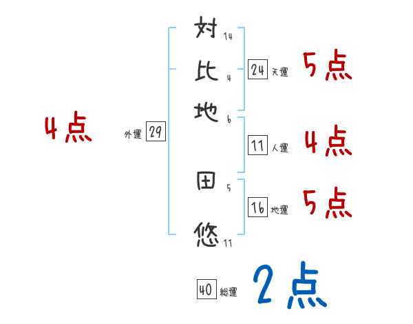 外運![]() | 対比地田悠さんの外運は29画の4つ星!完全主義で才能がある。厳格な心の持ち主。 生活面を象徴する運勢です。外部から受ける影響力を表し、結婚運、家庭運や職場、環境への順応性を表します。 |
