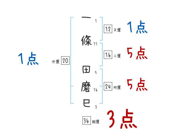 人運![]() | 一條田磨巳さんの人運は16画の5つ星!人望が厚く大きく発展する。逆転成功が見える。 性格や才能などを表す2番目に重要な運勢です。人間関係や協調性、社会的な成功に影響します。主に20歳から50歳ぐらいまでの中年期の運勢を表します。 |