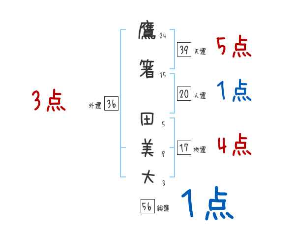 天運![]() | 鷹箸田美大さんの天運は39画の5つ星!社交性に優れ人望が厚い。人の上に立ち成功する。 家系が持つ宿命的な運勢を表します。祖先から受け継いだ苗字ですので自分の力が及びません。家柄を象徴します。 |