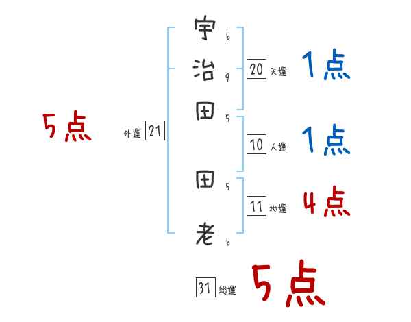 地運![]() | 宇治田田老さんの地運は11画の4つ星!着実に富や地位を得る幸運な人生。 個性を表す基礎的な運勢です。性格形成や対人関係、行動力など家庭環境に影響されます。主に誕生してから20歳くらいまでの若年期の運勢を表します。 |