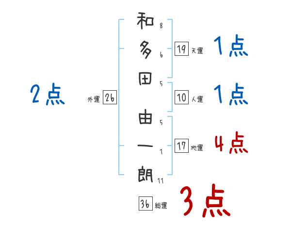 外運![]() | 和多田由一朗さんの外運は26画の2つ星!波瀾万丈かも。信頼できる人を大事にしましょう。 生活面を象徴する運勢です。外部から受ける影響力を表し、結婚運、家庭運や職場、環境への順応性を表します。 |