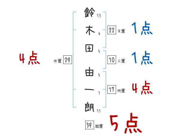 総運![]() | 鈴木田由一朗さんの総運は39画の5つ星!社交性に優れ人望が厚い。人の上に立ち成功する。 あなたの人生を表す1番重要な運勢です。生涯を通じて影響する総合運となり、主に50歳以降の晩年期に影響を及ぼします。 |