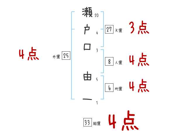 総運![]() | 瀬戸口由一さんの総運は33画の4つ星!権力志向でプライドが高い。勇気があり運を切り開き成功する。 あなたの人生を表す1番重要な運勢です。生涯を通じて影響する総合運となり、主に50歳以降の晩年期に影響を及ぼします。 |