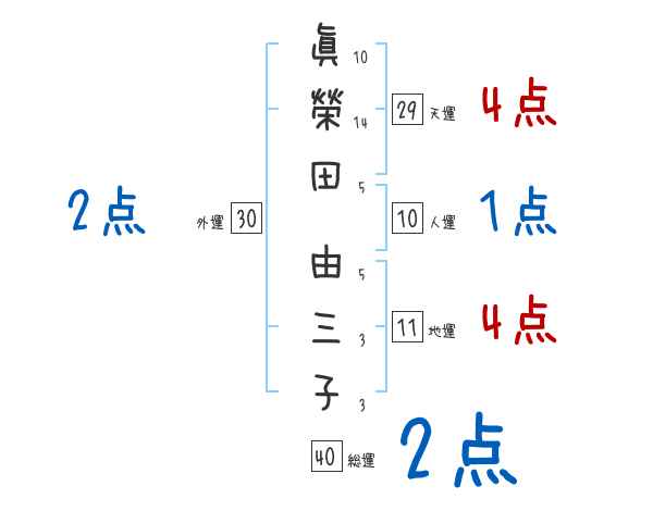 天運![]() | 眞榮田由三子さんの天運は29画の4つ星!完全主義で才能がある。厳格な心の持ち主。 家系が持つ宿命的な運勢を表します。祖先から受け継いだ苗字ですので自分の力が及びません。家柄を象徴します。 |