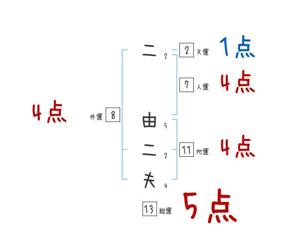 天運![]() | 二由二夫さんの天運は2画の1つ星!優しいですが積極性や意思の強さに欠ける傾向があります。家庭環境の乱れに注意しましょう。 家系が持つ宿命的な運勢を表します。祖先から受け継いだ苗字ですので自分の力が及びません。家柄を象徴します。 |