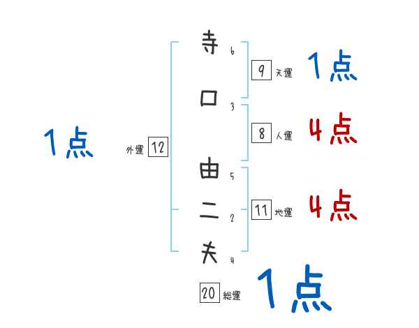 天運![]() | 寺口由二夫さんの天運は9画の1つ星!消極的で才能を発揮することが苦手なことも。周りの意見に耳を傾けましょう。 家系が持つ宿命的な運勢を表します。祖先から受け継いだ苗字ですので自分の力が及びません。家柄を象徴します。 |