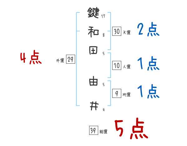 天運![]() | 鍵和田由井さんの天運は30画の2つ星!浮き沈みの激しさに注意しましょう。 家系が持つ宿命的な運勢を表します。祖先から受け継いだ苗字ですので自分の力が及びません。家柄を象徴します。 |