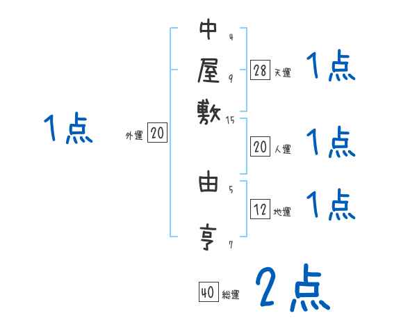 総運![]() | 中屋敷由亨さんの総運は40画の2つ星!自信過剰で物事に固執するためトラブルに注意。 あなたの人生を表す1番重要な運勢です。生涯を通じて影響する総合運となり、主に50歳以降の晩年期に影響を及ぼします。 |