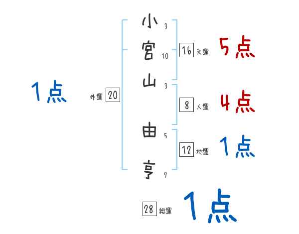 総運![]() | 小宮山由亨さんの総運は28画の1つ星!家庭環境に注意。スポーツで活躍できる能力があるかも。 あなたの人生を表す1番重要な運勢です。生涯を通じて影響する総合運となり、主に50歳以降の晩年期に影響を及ぼします。 |