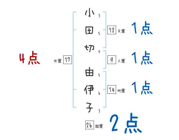 外運![]() | 小田切由伊子さんの外運は17画の4つ星!積極的な行動力。地位を気づき財産を手に入れる。純粋な心と直感力。 生活面を象徴する運勢です。外部から受ける影響力を表し、結婚運、家庭運や職場、環境への順応性を表します。 |