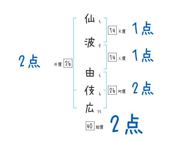 | 天運  | 仙波由伎広さんの天運は14画の1つ星!人に対して優しいがストレスを溜め込みがち。人間関係のトラブルを避けるよう気をつけましょう。家系が持つ宿命的な運勢を表します。祖先から受け継いだ苗字ですので自分の力が及びません。家柄を象徴します。 |