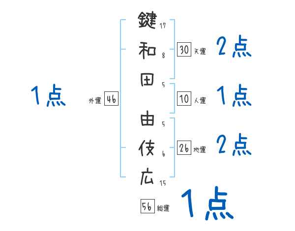 天運![]() | 鍵和田由伎広さんの天運は30画の2つ星!浮き沈みの激しさに注意しましょう。 家系が持つ宿命的な運勢を表します。祖先から受け継いだ苗字ですので自分の力が及びません。家柄を象徴します。 |