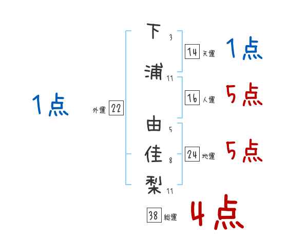 天運![]() | 下浦由佳梨さんの天運は14画の1つ星!人に対して優しいがストレスを溜め込みがち。人間関係のトラブルを避けるよう気をつけましょう。 家系が持つ宿命的な運勢を表します。祖先から受け継いだ苗字ですので自分の力が及びません。家柄を象徴します。 |