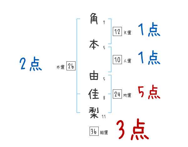 外運![]() | 角本由佳梨さんの外運は26画の2つ星!波瀾万丈かも。信頼できる人を大事にしましょう。 生活面を象徴する運勢です。外部から受ける影響力を表し、結婚運、家庭運や職場、環境への順応性を表します。 |