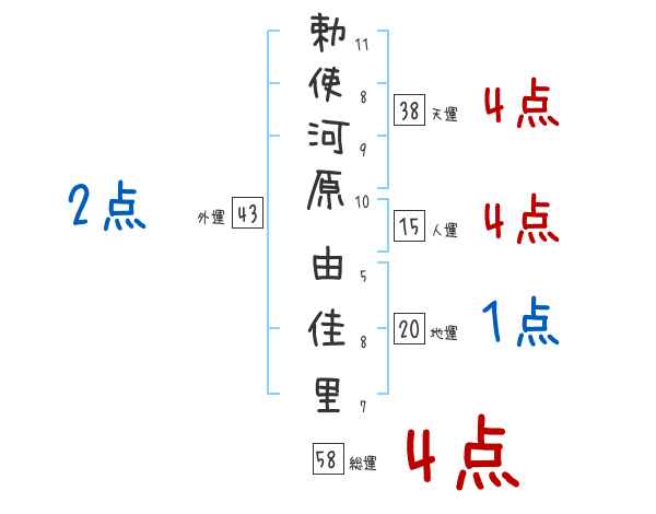外運![]() | 勅使河原由佳里さんの外運は43画の2つ星!頑固な性格で独立心が強いかも。やや非現実的で浪費に注意しましょう。 生活面を象徴する運勢です。外部から受ける影響力を表し、結婚運、家庭運や職場、環境への順応性を表します。 |
