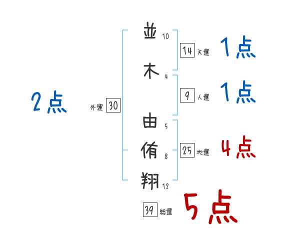 総運![]() | 並木由侑翔さんの総運は39画の5つ星!社交性に優れ人望が厚い。人の上に立ち成功する。 あなたの人生を表す1番重要な運勢です。生涯を通じて影響する総合運となり、主に50歳以降の晩年期に影響を及ぼします。 |