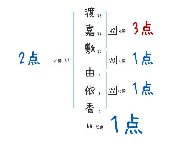 外運![]() | 渡嘉敷由依香さんの外運は44画の2つ星!誠実で慎重な性格。物事を考えすぎないように注意しましょう。 生活面を象徴する運勢です。外部から受ける影響力を表し、結婚運、家庭運や職場、環境への順応性を表します。 |