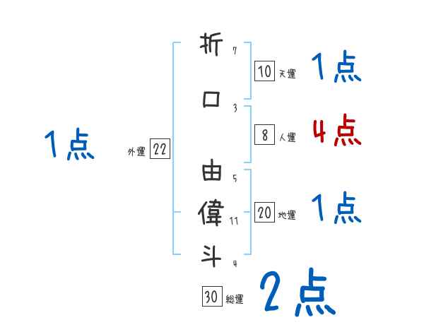 外運![]() | 折口由偉斗さんの外運は22画の1つ星!努力することが苦手ないっぽう手先が器用。芸術性にも優れる。 生活面を象徴する運勢です。外部から受ける影響力を表し、結婚運、家庭運や職場、環境への順応性を表します。 |